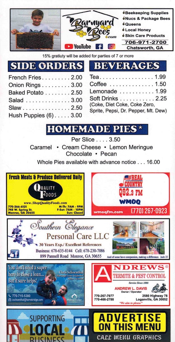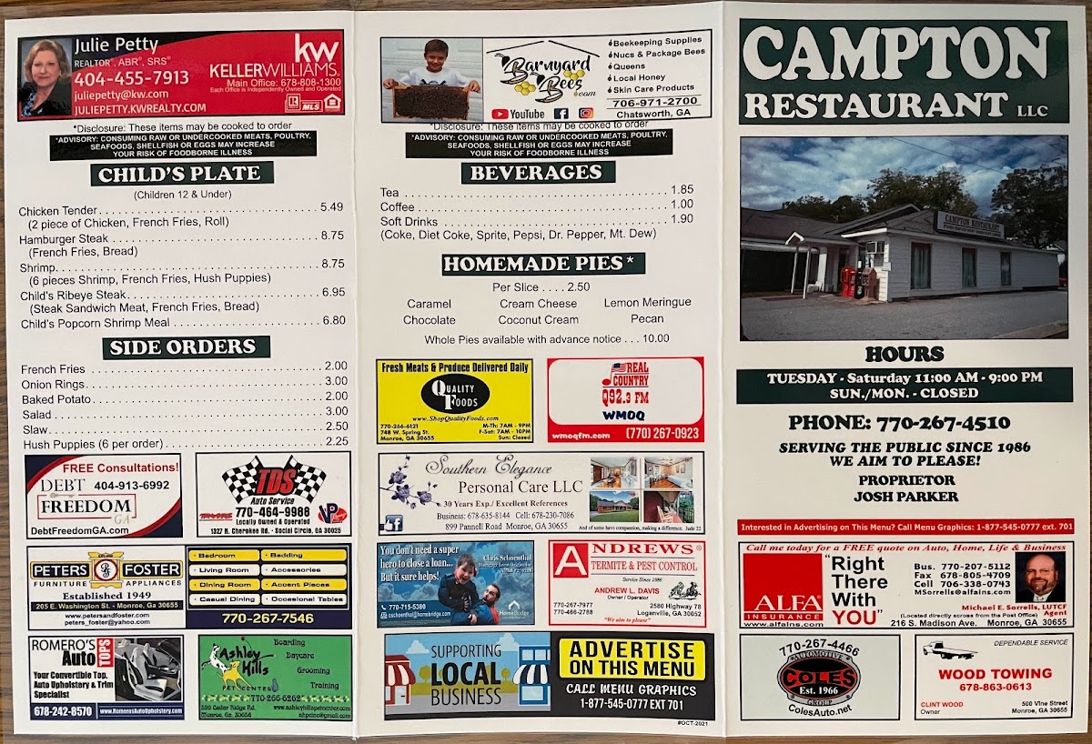 The menu at Campton Restaurant offers a straightforward, comforting selection of Southern-style dishes that suit casual dining any time of day. Whether you’re settling in for a hearty lunch or a relaxed dinner, you’ll find familiar favorites like slow-cooked pork chops, grilled chicken, and classic steak plates designed to feel like a wholesome, satisfying meal.